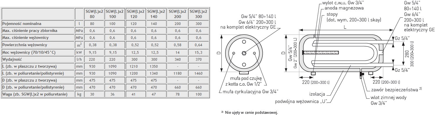 Wymiennik poziomy Galmet SGW(L)x2 120 o numerze katalogowym 21-128000 posiada podwójną wężownicę zamontowaną w układzie pionowym. Wymiennik służy do podgrzewania wody przy współpracy z tradycyjnymi kotłami na paliwa stałe. Jego pojemność to 120 litrów.