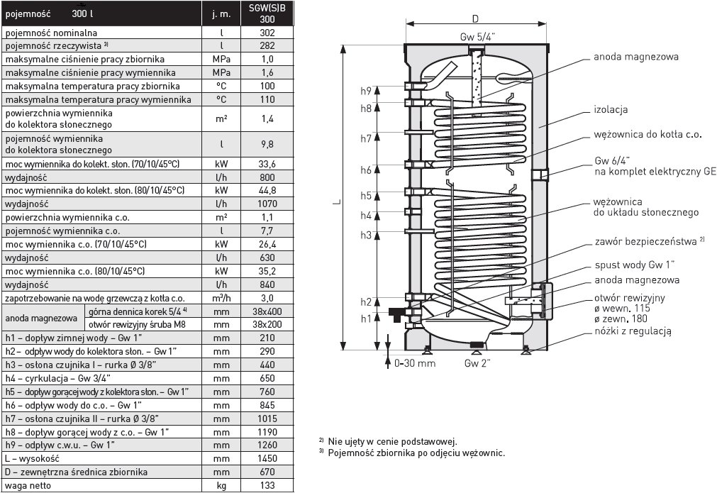 Wymiennik pionowy z dwiema wężownicami spiralnymi Galmet SGW(S)B SOL 300 o numerze katalogowym 26-309000S przeznaczony jest do podgrzewania i magazynowania ciepłej wody użytkowej zarówno przez kocioł c.o., jak i przez wykorzystanie energii słonecznej. Zasobnik pokryty jest materiałem typu skay. Ma pojemność 300l. Na wyposażeniu znajduje się zintegrowana grupa pompowa solarna dwudrogowa GT z pompą o niskim zużyciu energii oraz sterownik solarny STDC.