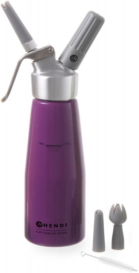 Syfon do bitej śmietany Kurt Scheller Edition Hendi o numerze katalogowym 975886 wykonany z aluminium. Wyposażony w 3 końcówki z polipropylenu oraz szczoteczkę.