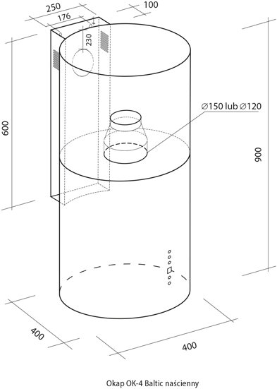 Okap kominowy, okrągły o szerkości 40cm, marki TOFLESZ OK-4 Baltic naścienny 40 czarny dysponujący wydajnością maksymalną 700m3/h, sterowany elektronicznie, wyposażony w oświetlenie LEDowe.